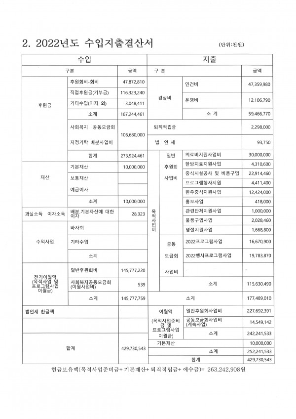 2022년도 수입지출결산서를 첨부해놓았으니 참고하시기 바랍니다.