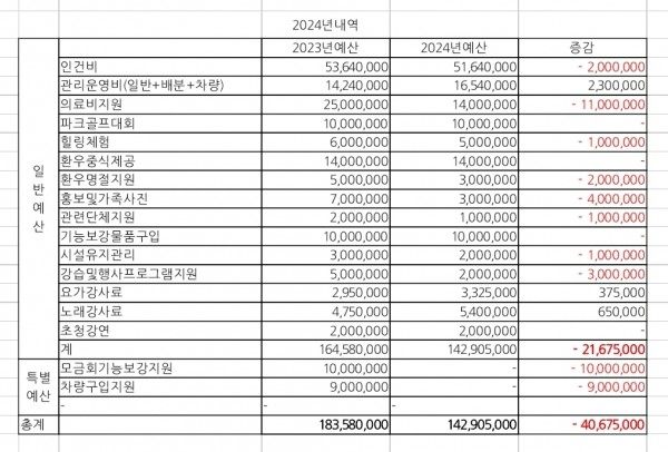2024년 예산은 지속될 것으로 예상되는 건설경기의 부진 등 경제상황을 고려하여 몇 가지 변경 및 감축예산으로 편성하였습니다.
